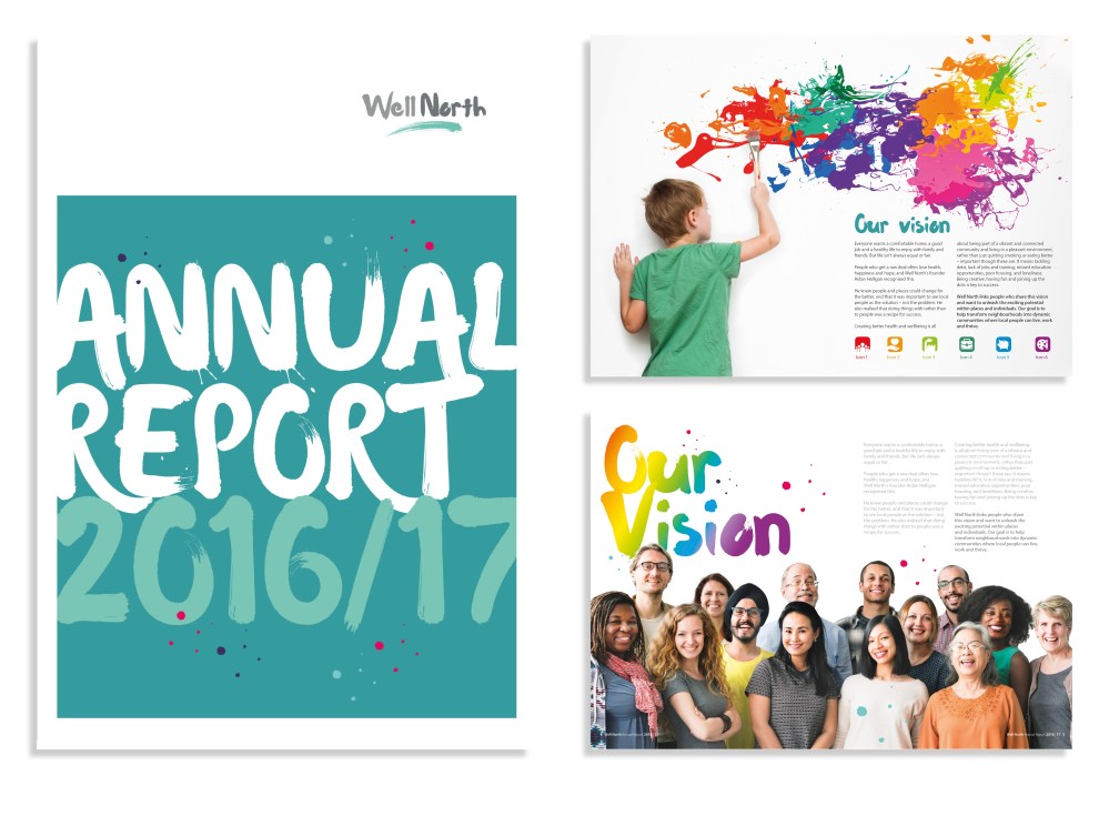 Well North (and now Well North Entrprises) work alongside various partners to find new ways of creating healthy communities in ten specific local places. The initial brief was to design the logo. Subsequently designs were produced for their first annual report. Although the final report was quite different to these visuals, they won the pitch against other agencies and reflect the dynamism, diversity and inclusivity of the ‘Pathfinders’ and the people they were aiming to support.